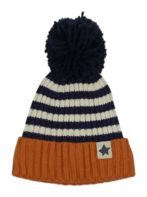 Tmavomodro-bílo-hnědá pruhovaná pletená podšitá čepice s bambulí