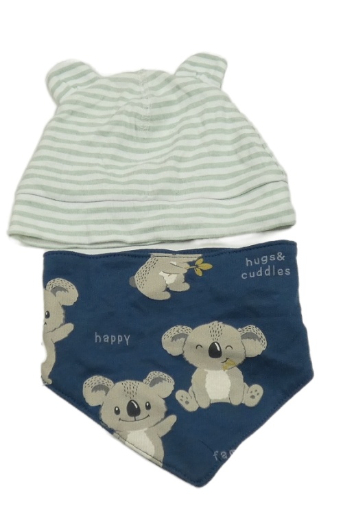 2 set - bílo-zelená pruhovaná čepice + tmavomodrý slinták s medvědy