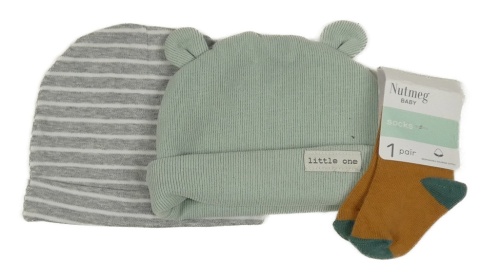Nové - 3set - 2x čepice - šedo-bílá pruhovaná + mintová s oušky + 1x okrovo-zelené ponožky