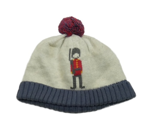 Šedo-modrá pletená čepice s vojáčkem a bambulí