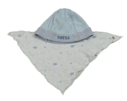 2Set - Světlemodro/modro/bílá čepice s logem GUESS + bílý šátek/slinták s obláčky a měsíci