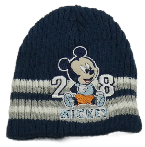 Tmavomodrá pletená čepice s šedými pruhy a Mickeym