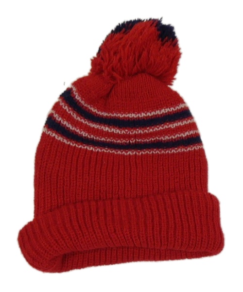 Červená pletená čepice s pruhy a bambulí