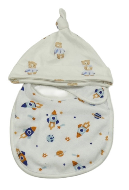 2set - Bílá čepice s medvídky + froté bryndák s raketami