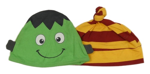 2x čepice - zelená s očima + žluto-vínová pruhovaná