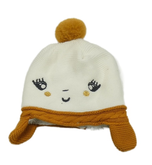 Bílo-hnědá pletená zateplená čepice s očima a bambulí orchestra