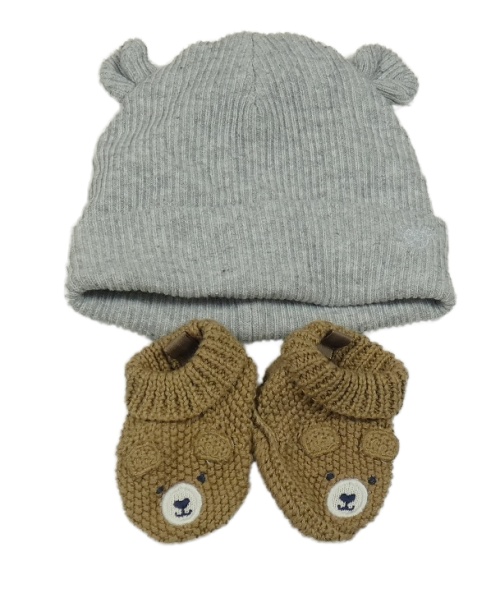 2set - Šedá žebrovaná čepice s oušky + hnědé pletené capáčky s medvědy