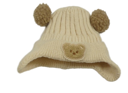 Krémová žebrovaná čepice s medvědem a bambulemi