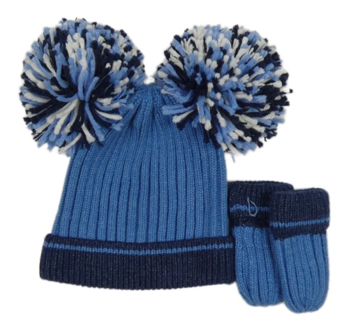 2set - Modrá žebrovaná pletená čepice s bambulemi + rukavice George