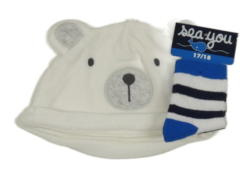 2set - Bílá sametová čepice - medvěd + bílo-černé pruhované ponožky