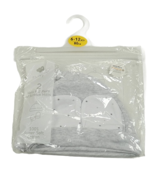 Nové - 4set - Světlešedá melírovaná bavlněná čepice + bílá s hvězdami + 2x rukavičky Primark