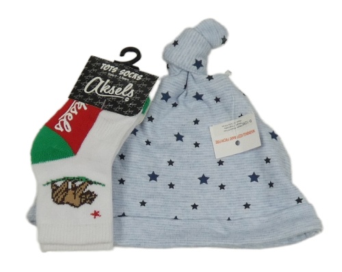 Nové - 2 set - modrá bavlněná čepice s hvězdičkami + bílo-červeno-zelené ponožky