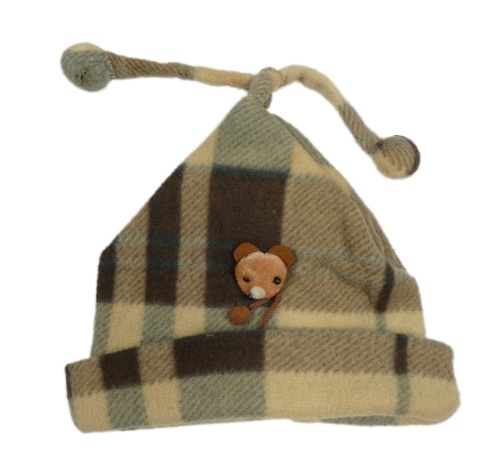 Hnědo-béžová kostkovaná fleecová čepice s medvídkem