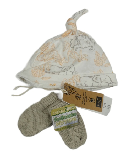 Nové - 2Set - Bílá čepice se zvířátky a listy F&F + béžové pletené rukavice se vzorem Soft Touch