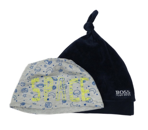 2x - Tmavomodrá sametová + šedá bavlněná čepice s vesmírem Huho Boss