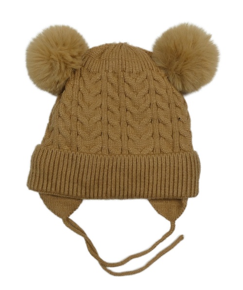 Hnědá vzorovaná úpletová zavazovací čepice s bambulemi noixx