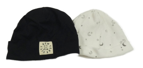 2x čepice - černá bavlněná s nášivkou + smetanová sametová s hvězdami