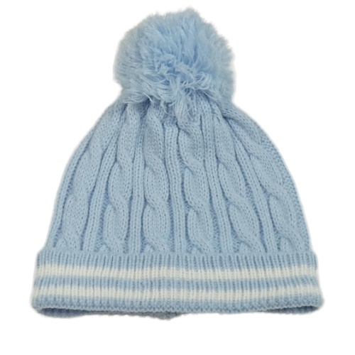 Světlemodrá čepice s bílými pruhy a bambulí