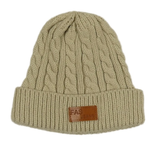 Světlebéžová vzorovaná pletená čepice s nášivkou