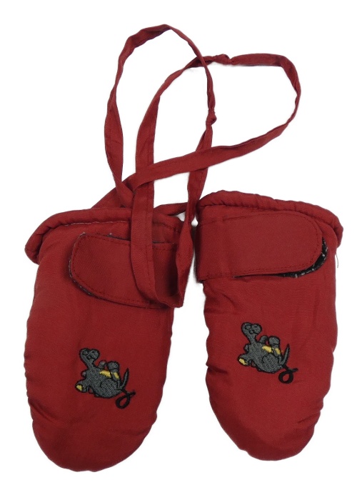Tmavočervené šusťákové prstové zimní rukavice s dinosaurem na šňůře