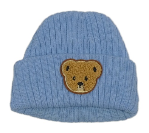 Modrá žebrovaná pletená čepice s medvídkem