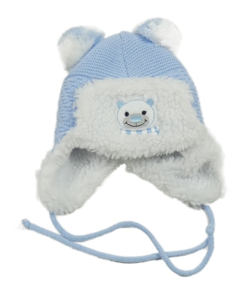 Světlemodrá vlněná zateplená čepice s medvídkem a bambulemi