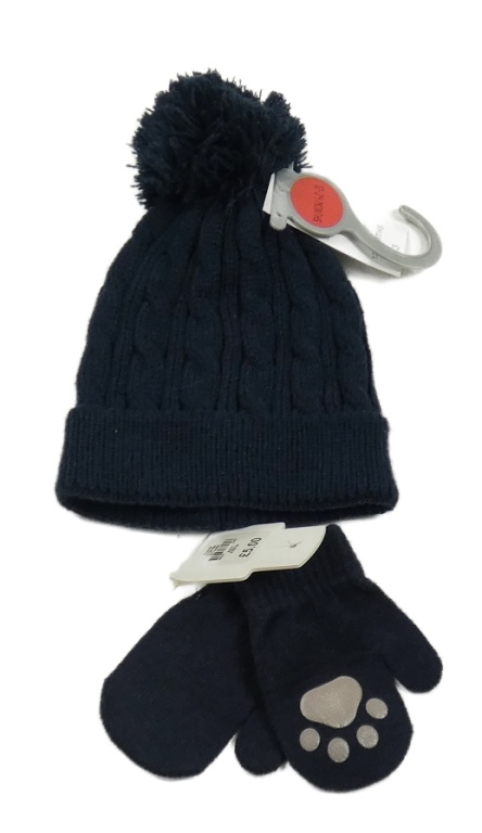 2set - Tmavomodrá pletená čepice s bambulí + palcové rukavice s tlapkou