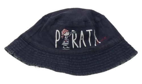 Tmavomodrý plátěný oboustranný klobouk s nápisem a pirátem