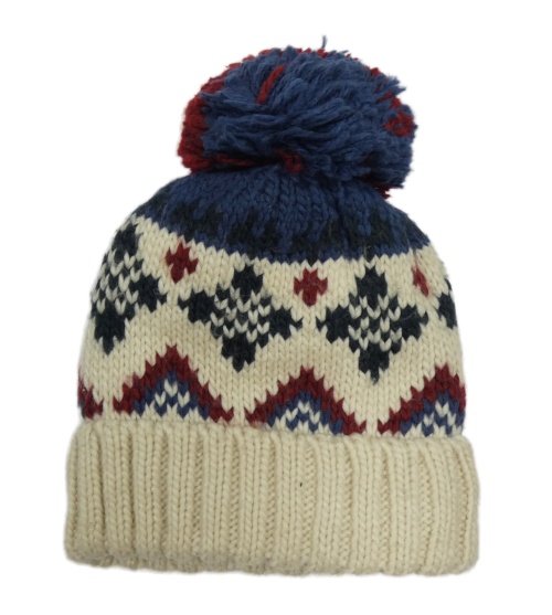Béžovo-tmavomodro-vínová vzorovaná pletená čepice s bambulí Next