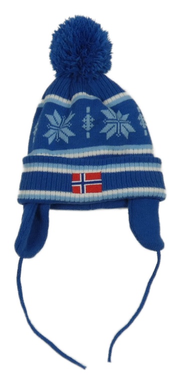 Modrá pletená čepice s vločkami a vlajkou a bambulí