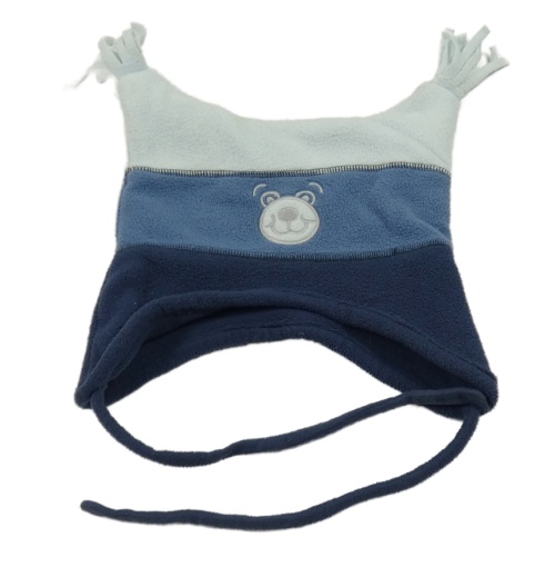 Tmavomodro-modro-světlemodrá pruhovaná fleecová ušanka s medvídkem