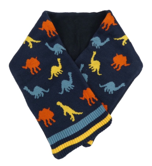 Tmavomodrá pletená podšitá šála s dinosaury a pruhy