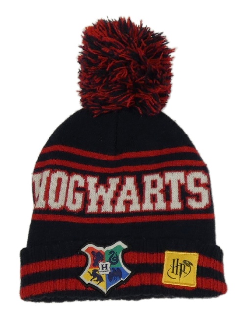 Tmavomodor-červená čepice s nápisem a bambulí - Harry Potter