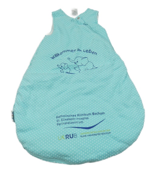 Světlemodrý puntíkatý zateplený spací pytel se slony a nápisy