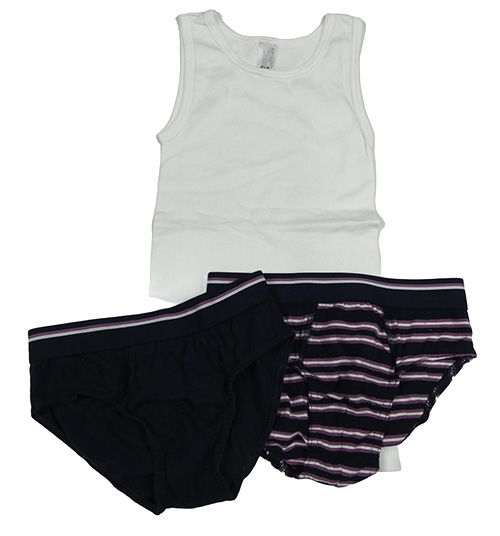 3set - Bílý nátělník + černo-vínovo-bílé pruhované slipy + tmavomodré C&A