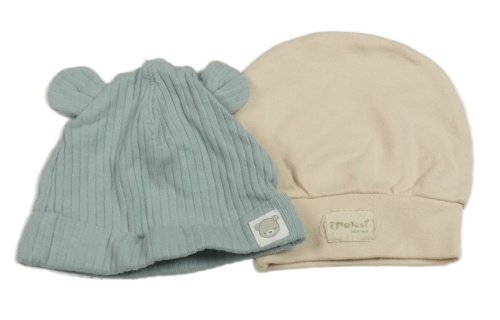 2x čepice - šedomodrá žebrovaná + světlebéžová s nášivkou