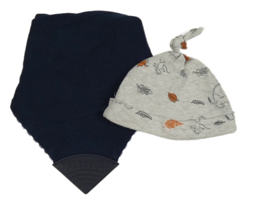 2set - Šedá čepice s listy + tmavomodrý slinták s kousátkem