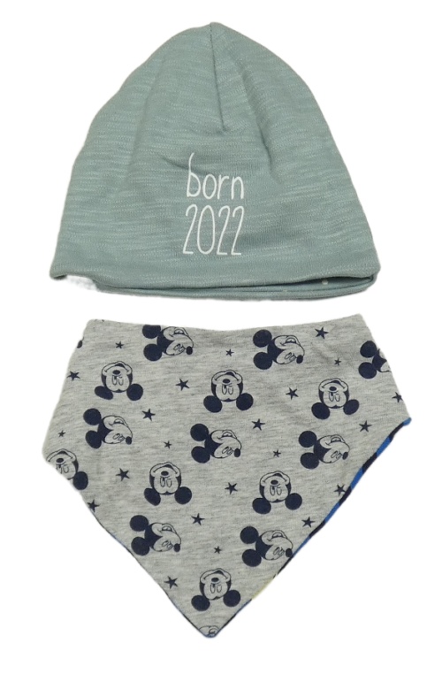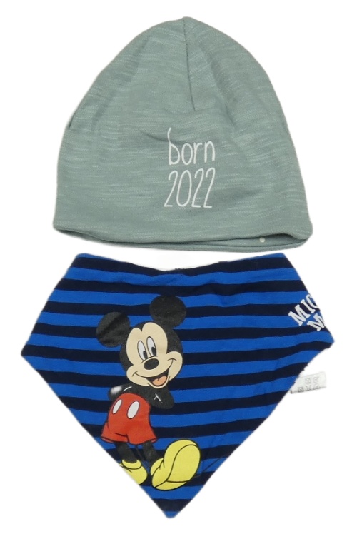 2set - zelená čepice s nápisem + šedý slinták s Mickeym