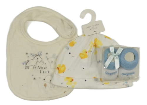 • Nové - 3 set - smetanový bryndák + bílá čepice s kachničkami + bílé ponožky s modrým lemem