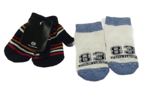 Nové - 2 set - bílo-modré protiskluzové ponožky + tmavomodré pruhované pletené palcové rukavice