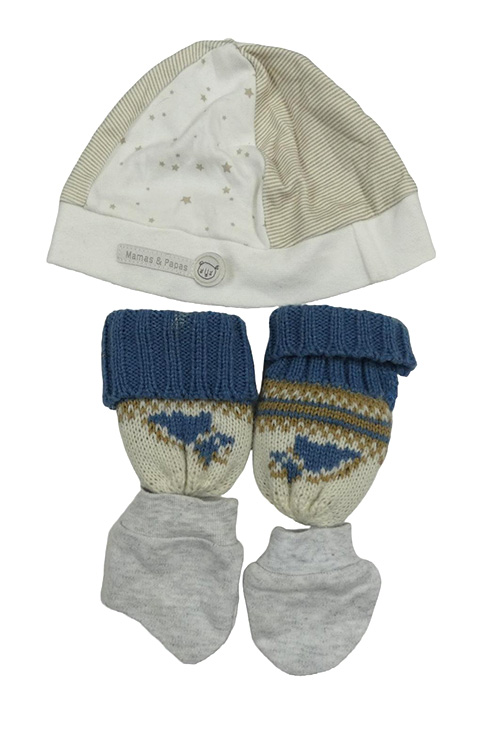 3 set - šedé rukavice + béžovo-modré pletené rukavice + smetanovo-béžová bavlněná čepice