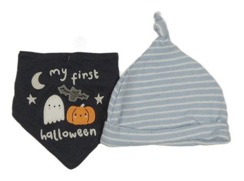• 2set - Světlemodro-bílá pruhovaná čepice + Tmavošedý slinták s duchem a dýní