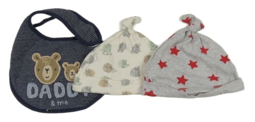 • 3set - 2x čepice - šedá s hvězdami + smetanovo-barevná s pejsky + 1x tmavomodro-bílý pruhovaný bryndák s medvídky