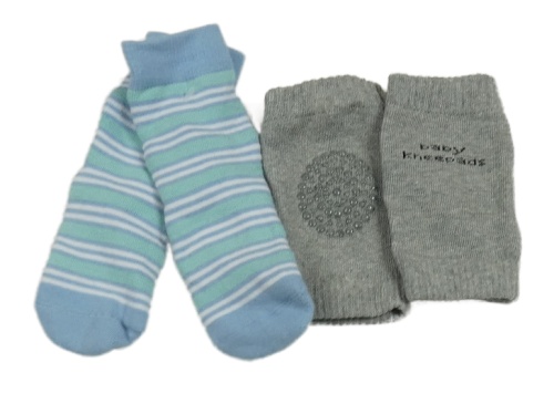 • 2Set - Modro/mentolovo/bílé pruhované teplé ponožky + šedé melírované návleky s nápisy a protiskluzem