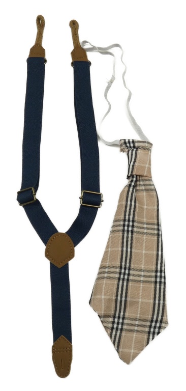 2set - Tmavomodré kšandy + béžovo-černo-bílá kostkovaná kravata