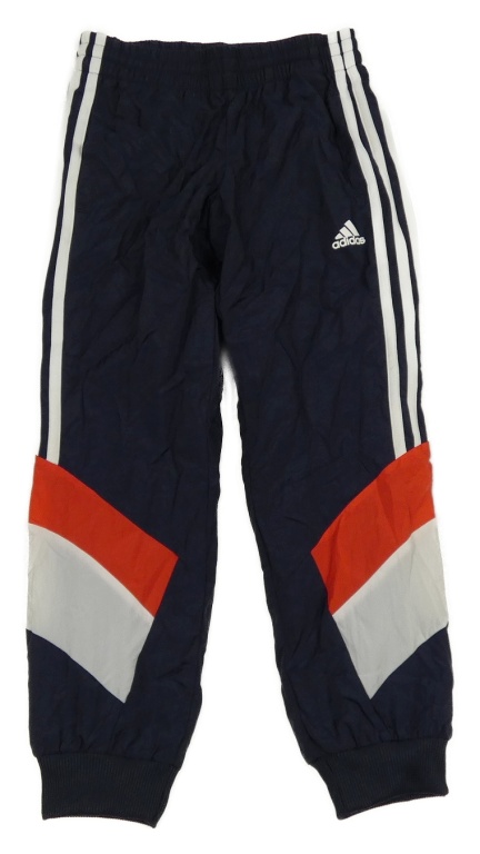 Tmavomodro-bílo-červené šusťákové kalhoty s pruhy Adidas
