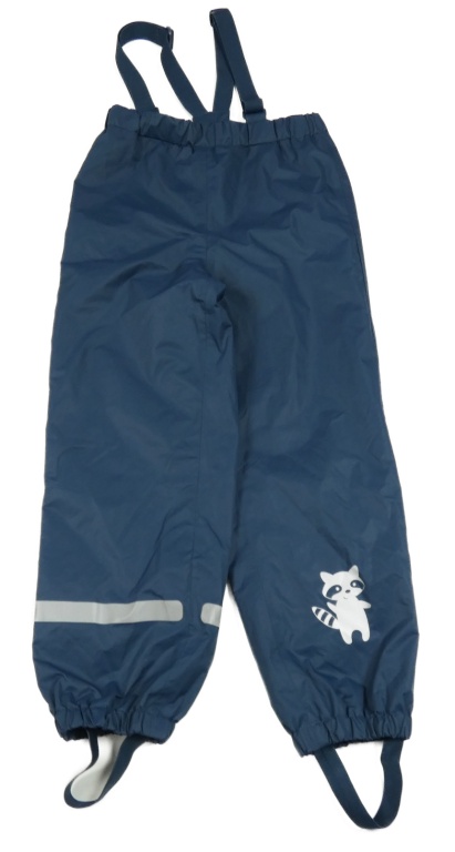 Tmavomodré šusťákové laclové kalhoty s mývalem Tchibo