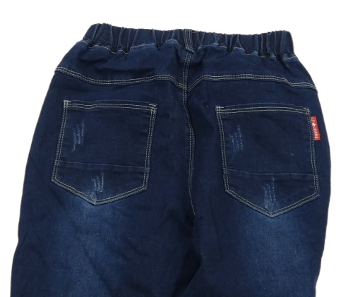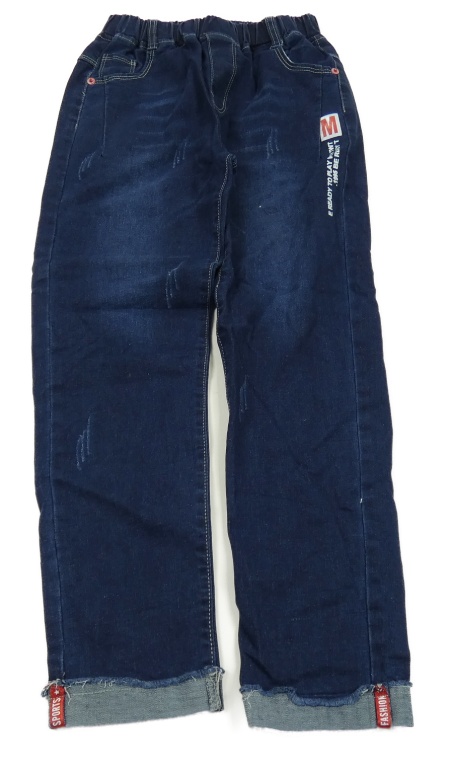 Tmavomodré rifle s nápisy a ošoupaného vzhledu