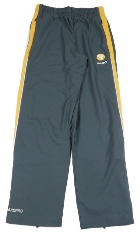 Šedé šusťákové kalhoty se žlutým pruhem a nášivkou jako