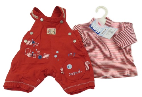 • Nové - 2Set - Červené šusťákové laclové zateplené laclové kalhoty s rybičkou a nápisy + červeno/bílý pruhovaný rolák Sucre d'orge